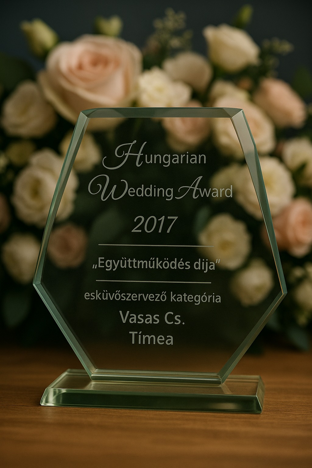 I won the Hungarian Wedding Award – the award of the Hungarian wedding professionals - in the category wedding planning in 2017 and I was among the TOP3 wedding planners in 2022 and 2024 too. This is a very important prize, voted by wedding professionals, those experts who had worked on hundreds of weddings before. They found me being the best wedding planner of the year. I am very proud of this positive feedback and for you this is a guarantee that you give your big day in an expert's hands, who surely provides quality services